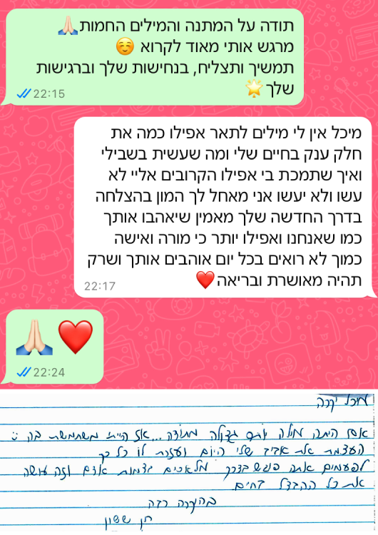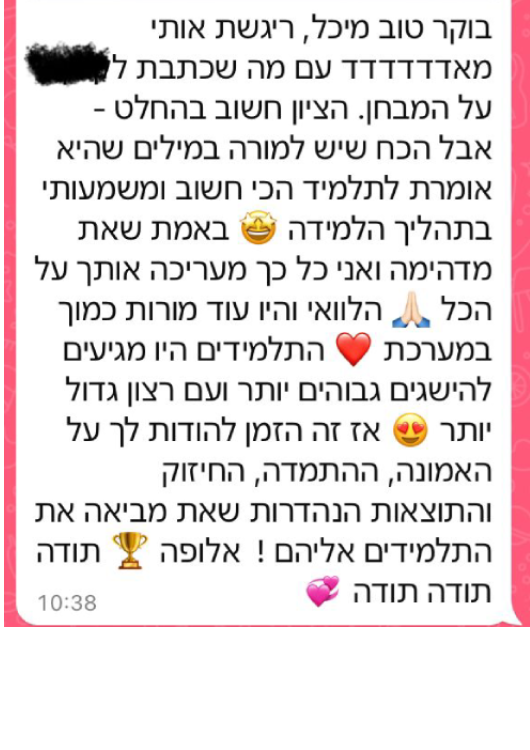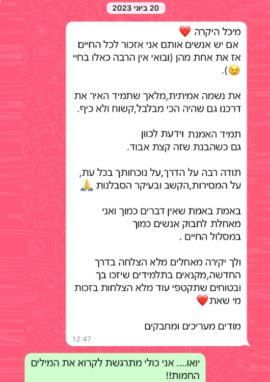 לאורך שנות עבודתי עם הנוער שלנו, הגעתי למסקנה שאפשר לחסוך מהם את מה שאני התחלתי להבין בגיל 35. כבר עכשיו לחזק בטחון עצמי, דימוי עצמי, לחיות קרוב לרצונות ולערכים שלהם, כלים ללמידה וריכוז, להתמיד ביעדים, לנהל נכון הזמן, להתמיד בשינויים, שחרור מאמונות מגבילות, חמלה עצמית, תודעת שפע ובעיקר אמונה בעצמם ובחלומות שלהם. אז אם מה שכתבתי כאן מעניין אתכם – דברו איתי